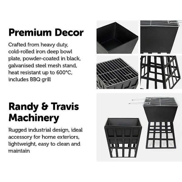 This industrial-chic fire pit from Randy & Travis Machinery is the perfect way to celebrate autumn's arrival. Crisp evenings are the perfect pairing as you, your family, and friends gather around its cozy warmth. Crafted from sturdy iron plate powder-coated in black, it looks as rugged as the outdoors itself. Pour your fuel of choice — timber or charcoal — inside and light it up. With its galvanised grill, it's all ready for your favourite BBQ foods. Incredible craftsmanship and solid design make it an ideal accessory for home exteriors of all styles.