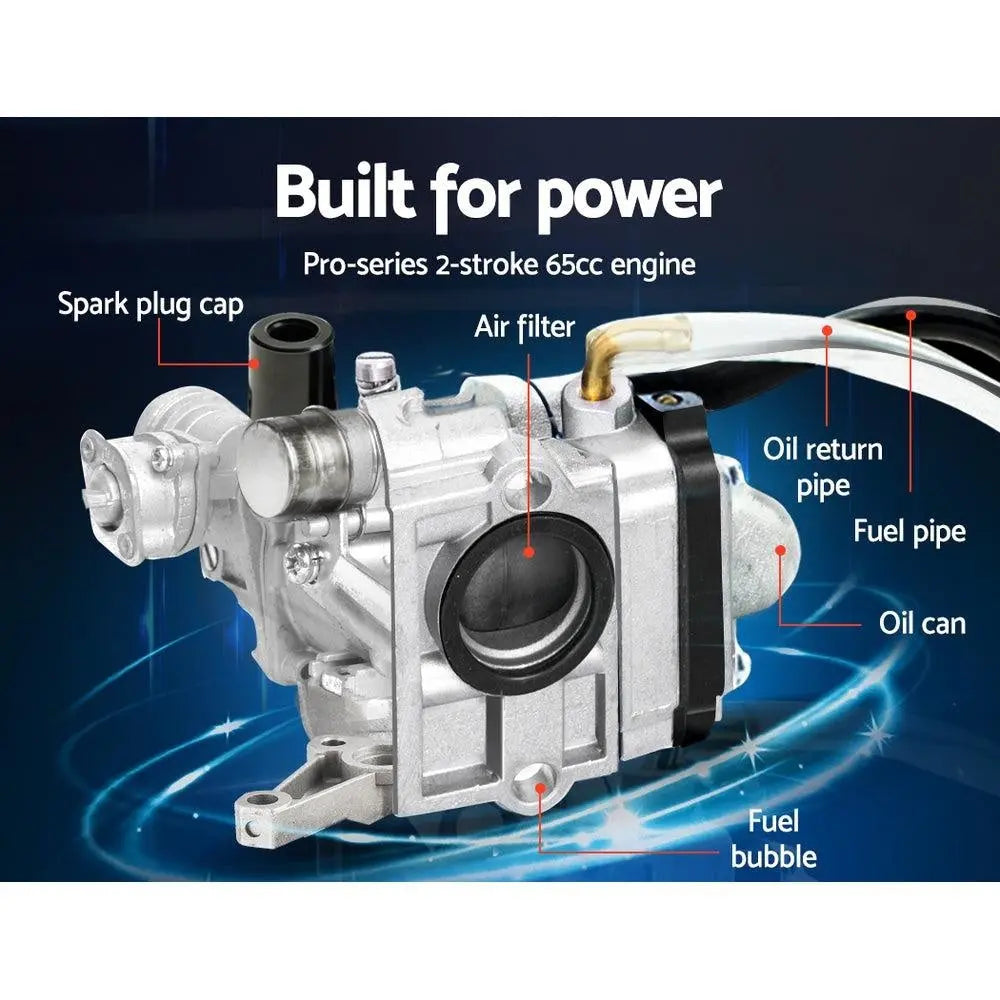 Get the earth moving quick and easy with the GIANTZ Hand-held Tiller. Featuring a 65cc 10,000rpm 2-stroke petrol motor, the tiller churns out soil deep and wide with its 16 teeth of hardened steel tines. The six blades allows you to till an extra-wide swath of 300mm and up to 150mm in depth in only one third of the time compared to four-blade models. In other words, you only need one pass with the tiller to pulverise the soil and get the right seedbed for your favourite crops. Operating the tiller is just as easy with its pull-start improved engine, steady handle and quick-release hand throttle control and all-terrain rubber tyres to transform back-breaking tilling work into a ground-breaking stroll. And when the tilling is done, just fold away the tiller and store with the rest of your tools. Ideal for the home gardener or small-scale commercial grower.