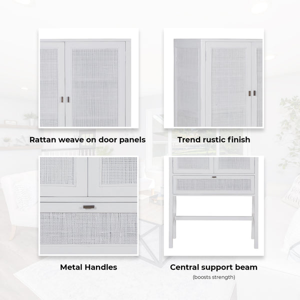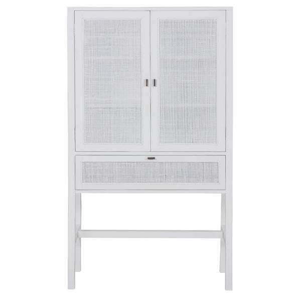 Jasmine Tall Storage Cabinet 90cm 2 Door 1 Drawer Mindi Wood Rattan - White