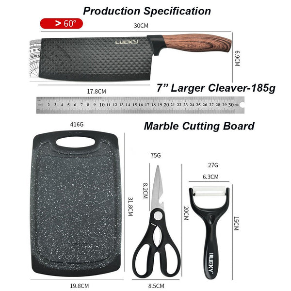 A specialized set of stainless steel nonstick knife sets for all your chopping needs. Includes Chef knife, Utility knife, Cleaver knife, fruit knife, Scissor & ceramic peeler.
