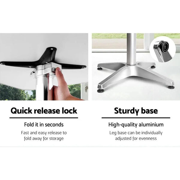 Two adjustable heights of 70cm or 110cm to set the table at the preferred level to suit your bar stool or chairs, a smooth stainless steel top and not least, a sturdy aluminium base to ensure your drinks only go down one way and definitely not on the floor. The base can also be adjusted to level things up on uneven floors. Stowing it away is just a simple flick of the quick release lock to fold it away.