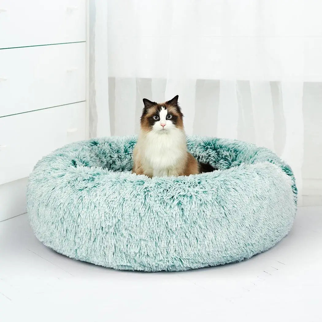Pet Bed Cat Dog Donut Nest Calming Mat Soft Plush Kennel Teal L