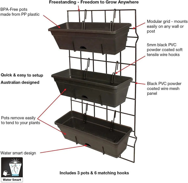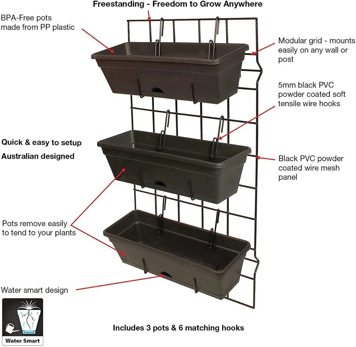The kit includes 3 water-smart pots and a wall mounted frame.