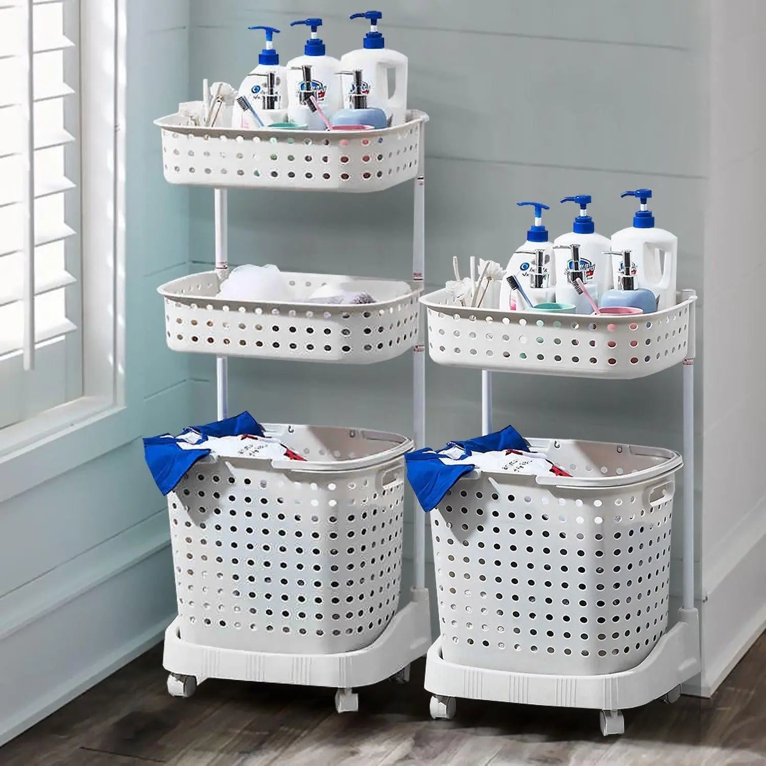 2 Tier Bathroom Laundry Clothes Baskets Bin Hamper Mobile Rack Removable Shelf