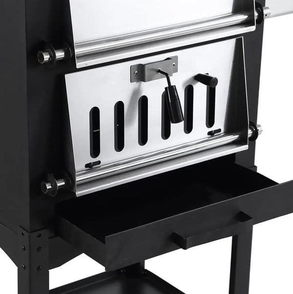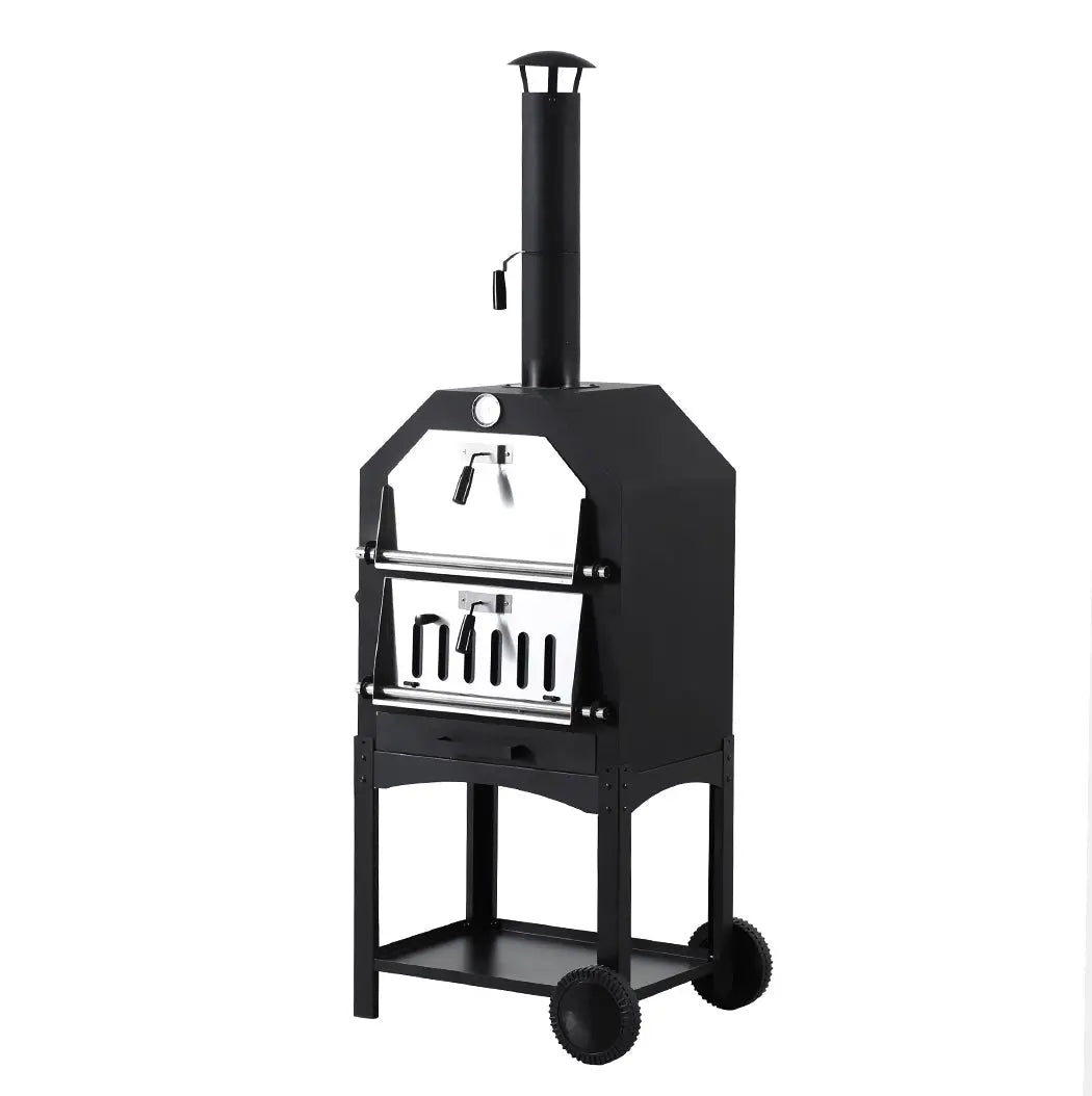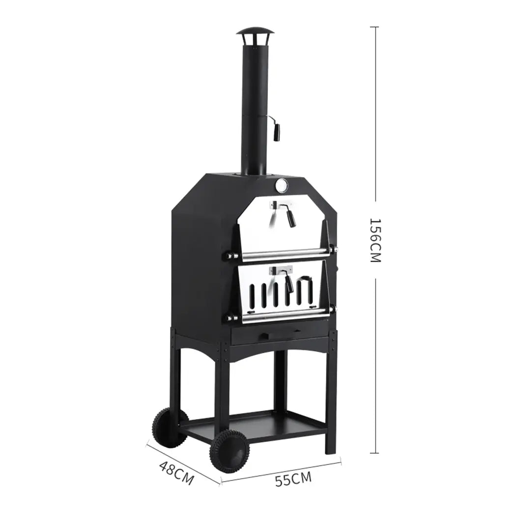 Our 3 in 1 design Wood Fired Pizza Oven uses charcoal or untreated wood fuel. You can use as pizza oven, grill or smoker. Features two wheels for convenient movement, and pull out ash tray for easy to clean. Better still, built-in integrated thermometer monitors cooking temperature.