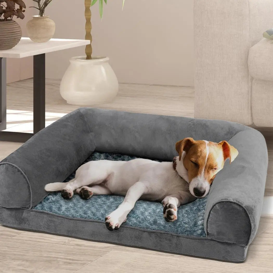 Worried about its durability? Our product is made from premium breathable velvet and oxford fabric material. Built with dense high-loft foam provides exceptional comfort. Does not easily absorb liquids giving you ample time to clean any mess your pet might make. Equipped with soft bolstered edges for great head and back support. Easily adjusts to your pet’s shape and size. The anti-slip bottom is provided for stable use of the bed, avoids any accidental slippage. A product that is designed to stay with your pet for a longer period, built with exquisite craftsmanship. Apart from its high-quality and luxury also a healthy choice for your pet causes no harm to their skin or causes any allergies, prevents dust and allergens from settling within the surface. Provided with two zippers for easy access of mattress and bolsters. Machine washable very easy to clean and maintain.