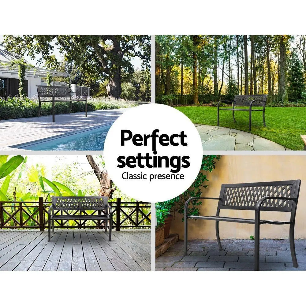 With its modernistic design, our Gardeon Garden Bench exudes classic and sophisticated appeal in every way. From its steel seat to PVC mesh patterned backrest, the bench also features powder-coated steel legs for enhanced strength and stability. Better still, the high-quality bench is also weather-resistant and rust-resistant. The bench is simply charming for use in any outdoor setting and has ample space for up to two persons with up to 220kg in maximum capacity.