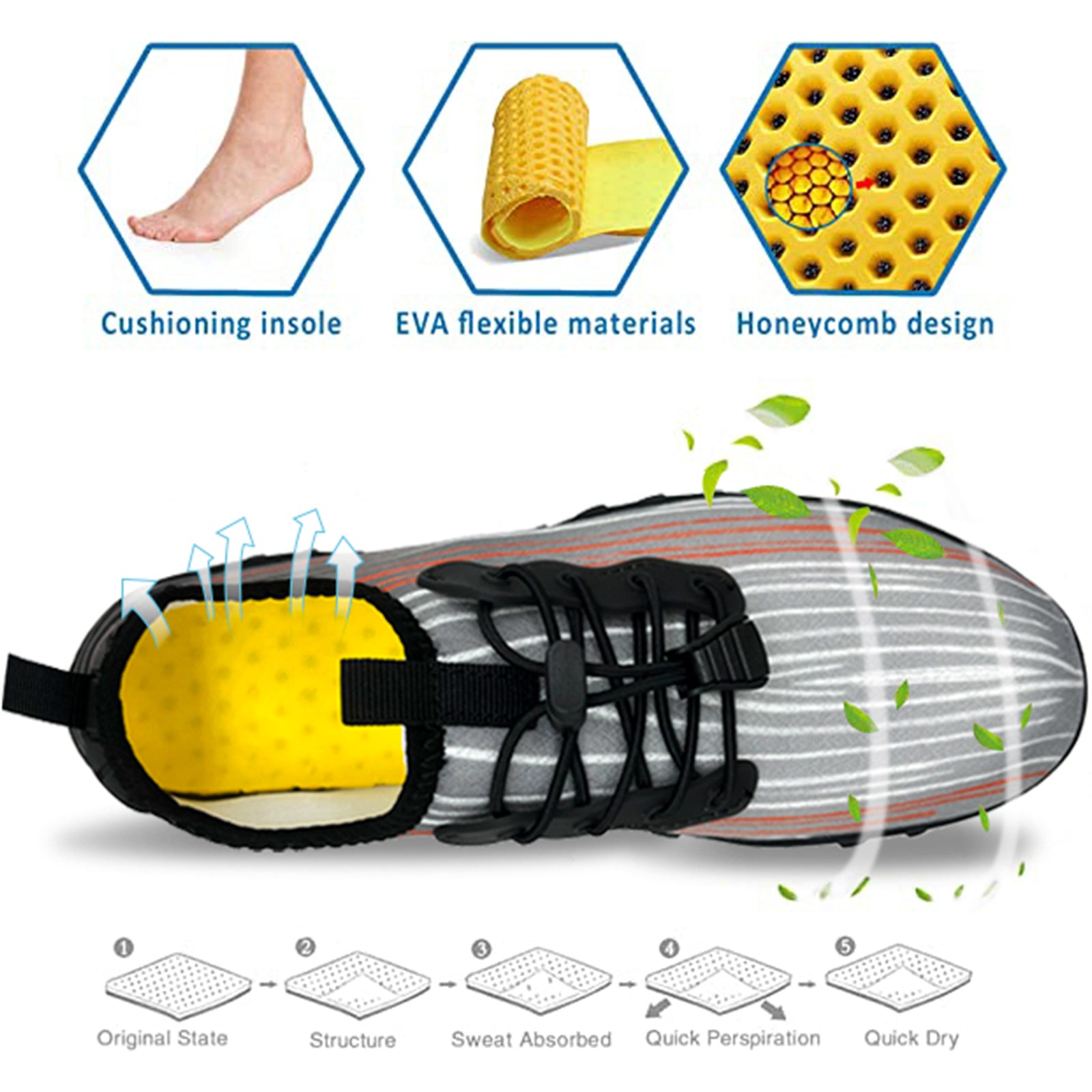 QUICK DRY DRAINAGE SYSTEM: Each bottom of these water shoes has several holes to ensure proper water outflow. It can quickly drain and cross-ventilate, preventing stuffy feet, foot slip, providing excellent flexibility and comfort. These holes are not big enough for sand or rocks to enter.
