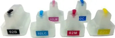 New HP02 refillable cartridges with Auto Reset Chip Cartridges are supplied in a set of 6 cartridges in an empty form. Set Contains 1 x Refillable HP02 Black with Auto Reset Chip 1 x Refillable HP02 Cyan with Auto Reset Chip 1 x Refillable HP02 Magenta with Auto Reset Chip 1 x Refillable HP02 Yellow with Auto Reset Chip 1 x Refillable HP02 Light Cyan with Auto Reset Chip 1 x Refillable HP02 Light Magenta with Auto Reset Chip Refill Instructions Black cartridge : 33ml Colour cartridges : 11mls Ink to use :