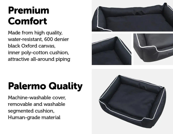 This bed for medium-sized dogs measures L100cm x 80cm x H25cm. It's made from an extra-tough and waterproof 600 denier Oxford canvas, which is durable enough for outdoor use yet comfy enough to provide plenty of pleasant dreams. The fabric comes in a black canvas with white piping, a handsome combination for most any existing colour scheme.