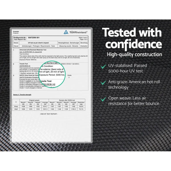 Bounce to your heart's content with the Trampoline. With its superior bounce characteristics featuring 72-piece triple rate springs, the 12-foot Trampoline enables safe and durable bouncing with no worries. The heavy-gauge steel framework is designed to handle all robust play and is UV-tested for quality and reliability. Other great features include a curve design for more rigidness, 20mm thick padding, anti-graze mat, safety netting and a double-lock zip-and-clip entry. Not least, the included basketball hoop, basketball and pump really adds an awesome fun factor to the entire ensemble.